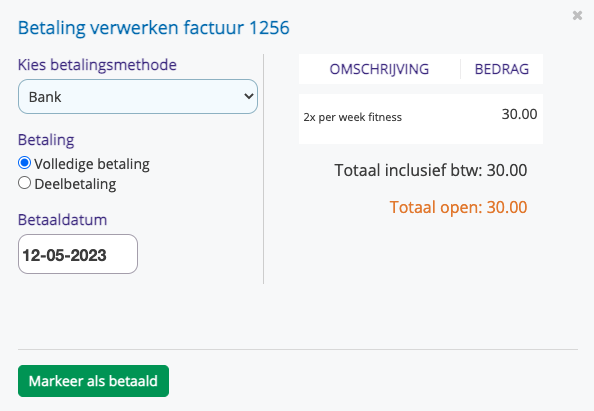 Ten slotte kies je de betaaldatum en klik je op "Markeer als betaald"