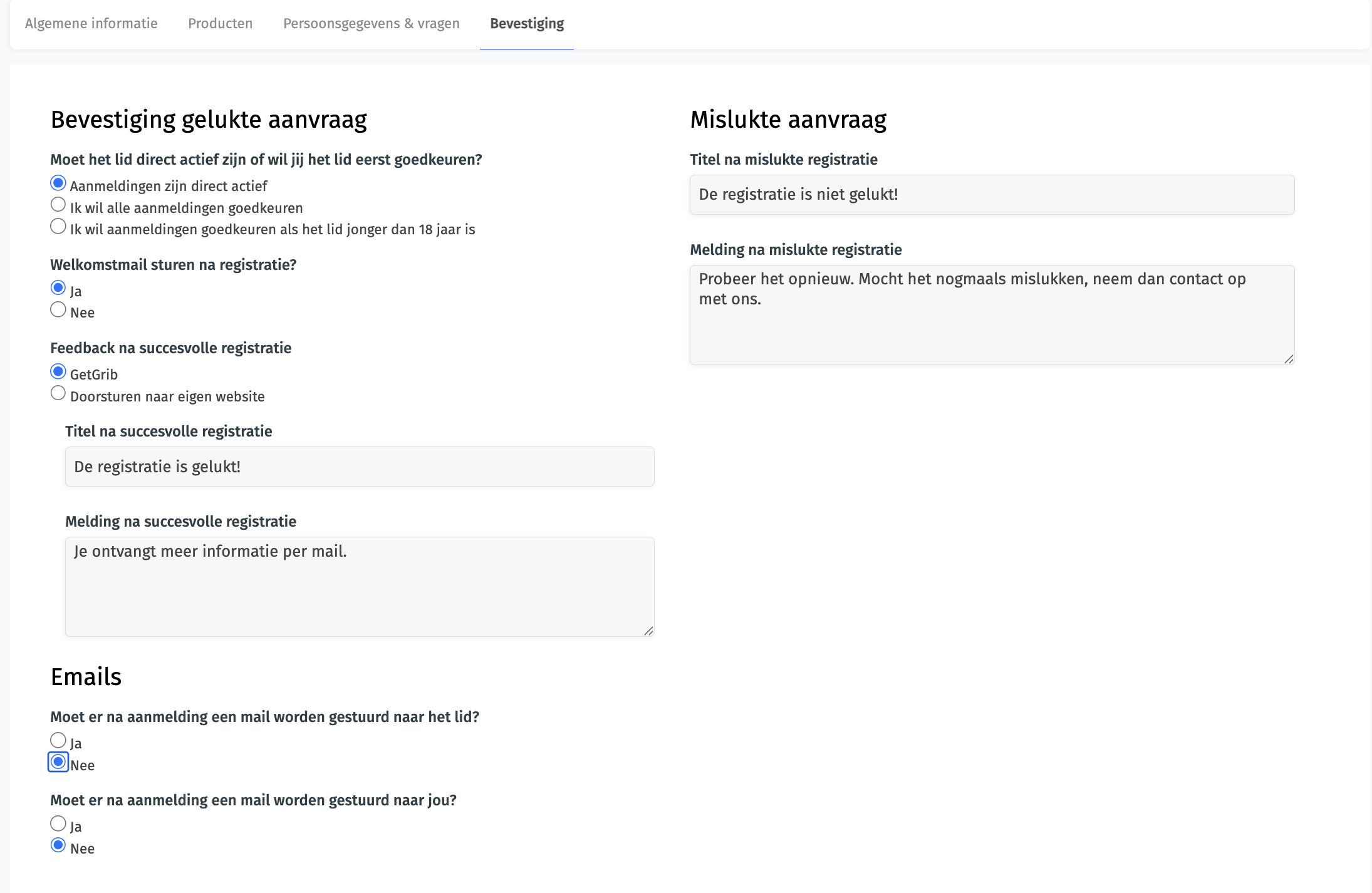 Stel in welke tekst verschijnt na een geslaagde inschrijving of een mislukte inschrijving.