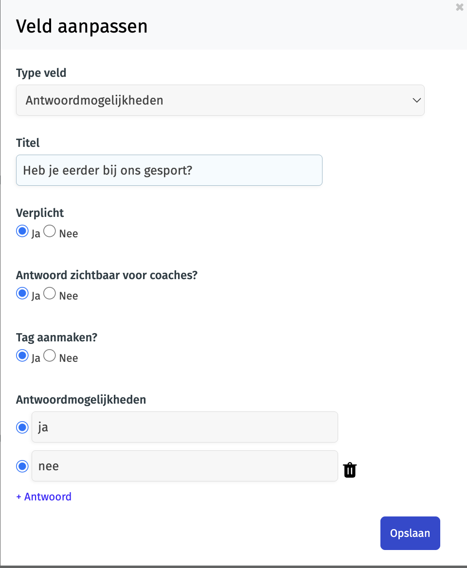 Bij radio en checkbox-vragen worden automatisch labels (tags) aangemaakt. Handig om te zien hoe een lid jouw club heeft gevonden.