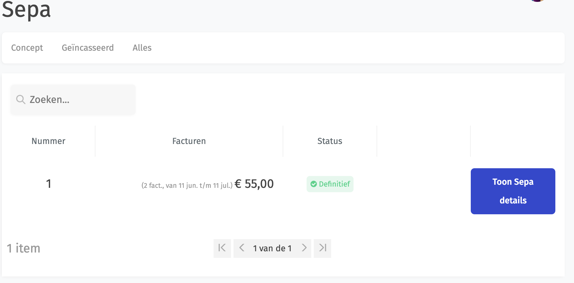 Als de factuurdatum is bereikt, komt de factuur op een lijst te staan: de SEPA-lijst. Die is als volgt te vinden: