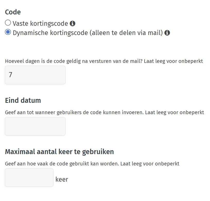 Dynamische kortingscode: een code zonder vooraf ingestelde waarde. De AI genereert dan automatisch unieke codes.