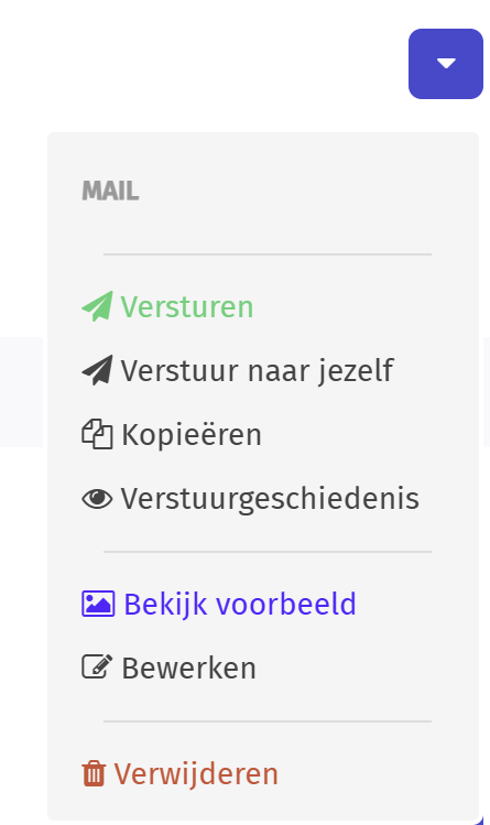 Je verstuurt de mail door rechts naast het gemaakte bericht op het driehoekje te klikken en vervolgens op ‘Versturen’. Daar kun je ook selecteren naar wie je de mail wilt sturen.