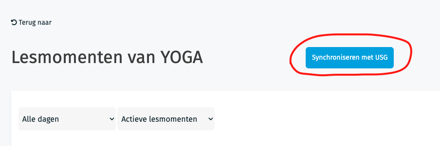 Als je klaar bent met de lesmomenten in te stellen, dan kun je de les synchroniseren met Urban Sports Group. Doe dat door op de blauwe knop bovenaan de lesmomenten te klikken. De les wordt dan aangemaakt in USG.