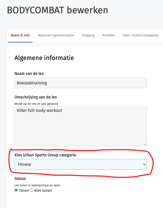 Als je niet wilt dat de les te reserveren is door USG klanten, stel deze dan in op de optie "Niet Beschikbaar In Urban Sports Group".