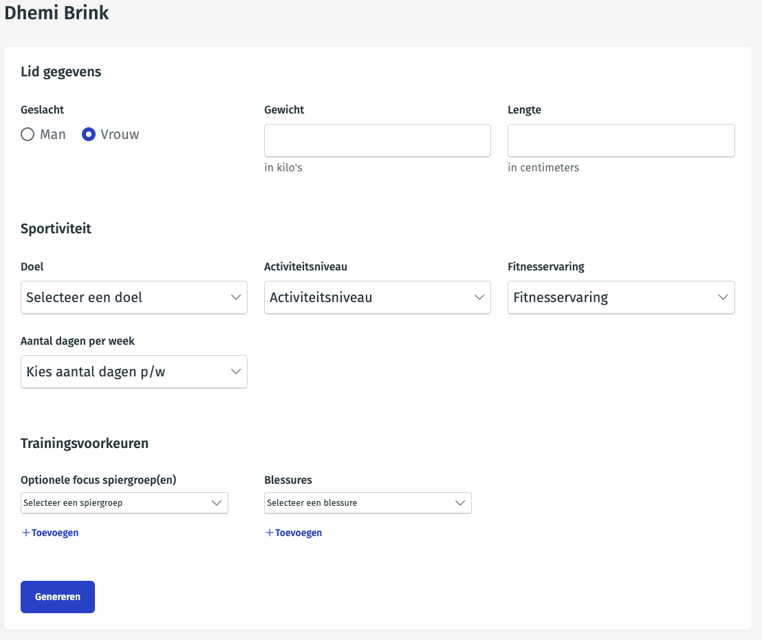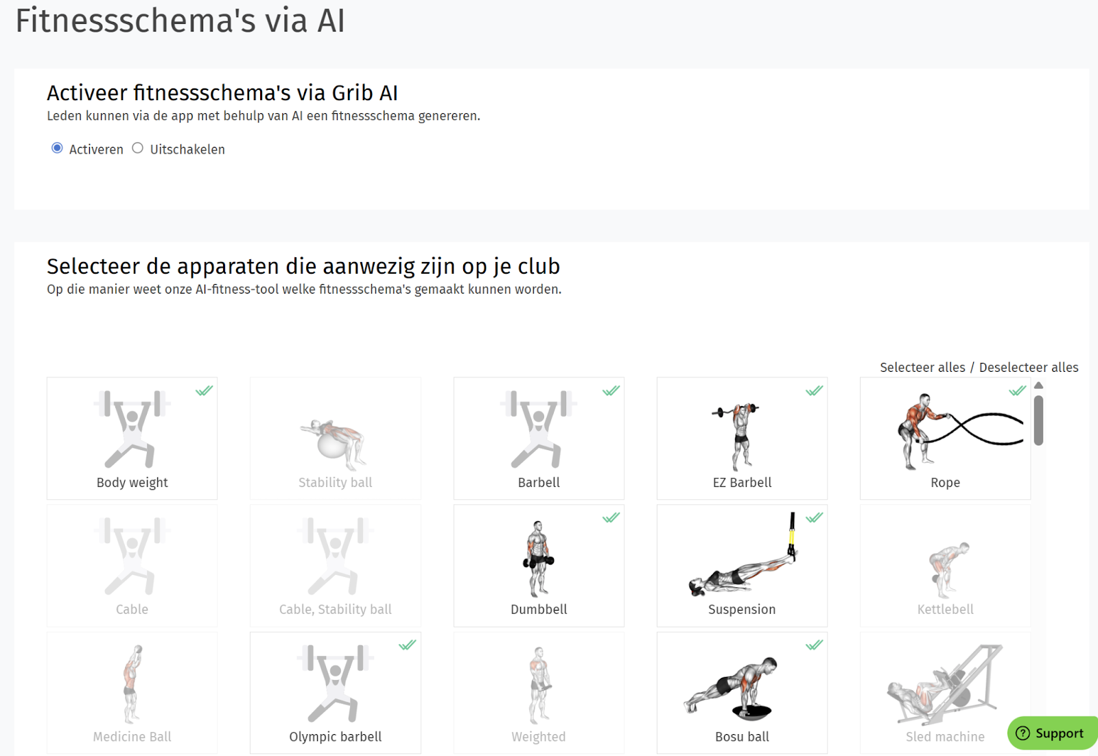 Let op Voordat leden hun eigen schema kunnen genereren, moet je als club eerst aangeven welke apparaten er in de club aanwezig zijn. Dit doe je eenmalig via Beheer > Fitnessschema’s via AI.
